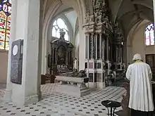 - Retable du maître-autel : Aucune inscription ne permet de le dater. Le tableau central est néanmoins signé : P. Le tourneur fecit 1640[34]. Un écu[35] du côté de l'évangile permet de cerner sa datation entre 1633 et 1640.