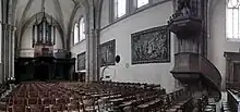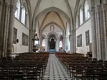 Pendant les travaux d'extension, l'intérieur de l'église est lui aussi embelli[24]. Il faut aussi réparer et consolider car l'église avait beaucoup plus souffert de l'ouragan de 1701 qu'on ne l'avait d'abord pensé[25]. Avant la Révolution, l'église compte ainsi quinze autels et plusieurs grands retables[26]. On place au milieu du XVIIIe siècle le grand autel, les marches et les crédences de marbre. On élève la grande tribune du bas de la nef en 1770 et on y place un orgue.