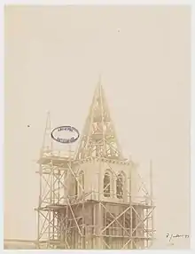Le 16 janvier 1563, entre 2 h et 3 h de l'après-midi, la flèche de l'église prend feu[17] est une seconde fois détruite. L'église est très endommagée[18]. La flèche n'est pas reconstruite, elle est remplacée par une petite tour carrée. L'autel est rétabli comme précédemment.
