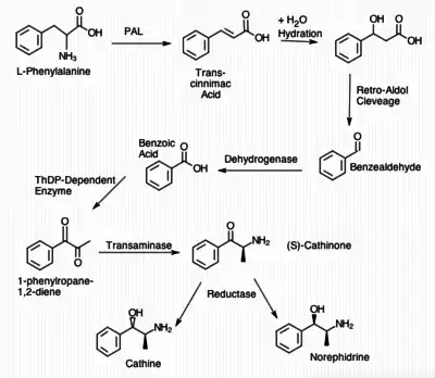 Dans la plante de khat, la biosynthèse de la cathinone s'opère à partir de phénylalanine.