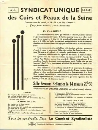 - Nous considérons que le syndicat, qui doit être le mouvement de résistance et de lutte, doit aussi être l'école sociale du prolétariat. Et pour redonner à celui-ci toute sa valeur morale et sa combattivité qui, en d'autres temps, fit sa fierté. Nous convions fraternellement compagnes et compagnons de notre industrie à assister régulièrement aux causeries éducatives que nous organisons tous les quinze jours, les mardis, à 20 h. 30, à la Bourse du travail.
