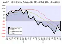 ![]() Indice déflaté en glissement annuel des maisons individuelles durant la période 2004–2006 extrait des données publiques du gouvernement américain et de l'association des agents américains du Massachusetts. Notez que : (1) l'évolution des prix en glissement annuel décroît; (2) la baisse des prix s'accélère; (3) l'allure générale de cette courbe est cohérente avec un sommet du marché immobilier et cohérente avec un sommet du marché en été 2005, avec un point d'inflexion à la mi-août et ensuite la baisse (source: bostonbubble.com.) |
