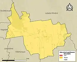 Le retrait-gonflement des sols argileux est susceptible d'engendrer des dommages importants aux bâtiments en cas d’alternance de périodes de sécheresse et de pluie. La totalité de la commune est en aléa moyen ou fort (44,5 % au niveau départemental et 48,5 % au niveau national). Sur les 62 bâtiments dénombrés sur la commune en 2019, 62 sont en aléa moyen ou fort, soit 100 %, à comparer aux 75 % au niveau départemental et 54 % au niveau national. Une cartographie de l'exposition du territoire national au retrait gonflement des sols argileux est disponible sur le site du BRGM[28],[Carte 3].