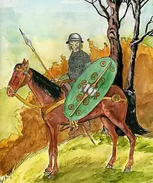 Il existe également des zones d'incertitudes quant à l'usage du bouclier — qui ne fut, en général, pas utilisé par la cavalerie grecque avant les environs de 250 av. J.-C. — ou de celui des lances longues, qui normalement empêchait celui du bouclier puisqu'elles devaient le plus souvent être tenues à deux mains) — ou courtes, la Doru mentionnée par Polybe[17],[18]. La plupart des représentations montrent des cavaliers équipés du petit bouclier parma equestris mais le monument d'Ahenobarbus datant de 122 av. J.-C. et la pièce de montre de 136 av. J.-C. présentent des cavaliers sans bouclier. Sidnell suggère que, puisque les « chevaliers » devaient fournir leur propre équipement, ils pouvaient avoir choisi leur propre combinaison de protections et d'armes — par exemple la lance longue sans bouclier ou la lance courte avec celui-ci[16] — mais les preuves sont trop rares que pour tirer des conclusions définitives.