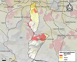 La commune est vulnérable au risque de mouvements de terrains constitué principalement du retrait-gonflement des sols argileux[36]. Cet aléa est susceptible d'engendrer des dommages importants aux bâtiments en cas d’alternance de périodes de sécheresse et de pluie. 23,4 % de la superficie communale est en aléa moyen ou fort (88,8 % au niveau départemental et 48,5 % au niveau national). Sur les 104 bâtiments dénombrés sur la commune en 2019, 77 sont en aléa moyen ou fort, soit 74 %, à comparer aux 98 % au niveau départemental et 54 % au niveau national. Une cartographie de l'exposition du territoire national au retrait gonflement des sols argileux est disponible sur le site du BRGM[37],[Carte 3].