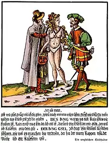 - Cete gravure est traditionnellement décrite comme la représentation d'un mari vieilli riche, d'une jeune épouse ceinturée rétive, et d'un bel amant. En réalité l'homme de droite est le client d'une prostituée qu'il vient de payer. Cette dernière donne l'argent à son maquereau à gauche. Le client qui a la clé de la serrure en main, a désormais le droit de coucher avec elle. Cf (en) Christa Grossinger, Picturing Women in Late Medieval and Renaissance Art, Manchester University Press, , p. 97.