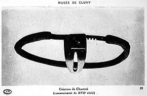 L'origine médiévale de l'utilisation de telles « ceintures » est remise en question par Albrecht Classen, professeur au département d’études allemandes de l’Université d’Arizona qui a analysé ce qui a pu être écrit sur le sujet – des textes généralement allégoriques ou satiriques – afin de « mettre définitivement fin à ce mythe ». Ainsi, les ceintures de chasteté, faites en métal et utilisées pour garantir la fidélité féminine n’auraient jamais existé au Moyen Âge[2]. Si leur origine semble italienne vers le XVe siècle et assez bien documentée (appelées « ceintures de Vénus », ou « ceintures florentines »), elles sont vraisemblablement créées, de manière très anecdotiques, dans les cités telles que Florence, Milan, Rome ou Venise, leurs fonctions restent mystérieuses : protection contre le viol ? Jeu érotique ? Instrument de torture[9] ? Les exemplaires parfois présentés dans des musées ne seraient que des objets fantaisistes qui se réfèrent à un passé imaginaire, fabriqués au XVIIIe ou au XIXe siècle comme objets de curiosité ou de plaisanterie[2]. Ces dispositifs sont utilisés lors des pratiques de BDSM.
