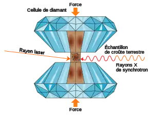 La cellule à enclumes de diamant est un dispositif expérimental qui permet de soumettre un matériau à des pressions et températures très élevées et de réaliser de nombreuses mesures physiques dans ces conditions.