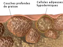 La cellulite est une variation physiologique de la répartition de la graisse, augmentée au niveau de l'hypoderme des cuisses, des fesses et des hanches[2]. La peau y a un aspect capitonné, parfois dit en « peau d'orange »[2].