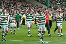 Le premier jeu de maillots du Celtic Football Club est blanc à col vert[5], avec en guise d'écusson une croix celtique de couleur rouge[gm 15] ; le short est noir et les chaussettes vertes. Le passage aux rayures vertes, couleur symbolique de l'Irlande, et blanches se fait début 1889[gm 15]. D'abord verticales, les rayures deviennent horizontales à l'été 1903[5]. Les grands succès connus par le club les années suivantes favorisent l’adoption définitive de ce maillot par le club et ses supporters[gm 15]. D'abord noirs, le short et les bas passent progressivement au blanc et au vert[76]. Au milieu des années 1990, le dessin des rayures est un temps modifié (avec une alternance de fines et de larges rayures vertes), mais cette excentricité ne dure pas.