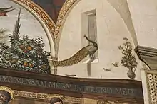 L'inscription qui court au dos et au-dessus des têtes des apôtres se lit comme suit : Ego dispono vobis sicut disposuit mihi pater meus regnum ut edatis et bibatis super mensam meam in regno meo (je vous prépare le royaume comme mon père me l'a préparé pour manger et boire à ma table dans mon royaume), expression également utilisée pendant la messe, qui fait allusion à la transmigration dans le Royaume des Cieux. Au-delà, on peut voir un jardin similaire à celui d'Ognissanti, mais plus schématique, avec des arbres fruitiers, des cyprès et un palmier, symbole du martyre. Parmi les oiseaux en vol, on voit deux couples voler ensemble, symbole de cycles naturels qui se renouvellent, et un paon, symbole d'immortalité. Deux vases à fleurs faisant référence à la symbolique mariale (lys, roses) ornent les côtés des lunettes.