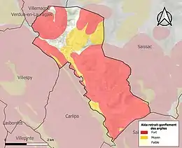 Le retrait-gonflement des sols argileux est susceptible d'engendrer des dommages importants aux bâtiments en cas d’alternance de périodes de sécheresse et de pluie. 90,9 % de la superficie communale est en aléa moyen ou fort (75,2 % au niveau départemental et 48,5 % au niveau national). Sur les 273 bâtiments dénombrés sur la commune en 2019, 92 sont en aléa moyen ou fort, soit 34 %, à comparer aux 94 % au niveau départemental et 54 % au niveau national. Une cartographie de l'exposition du territoire national au retrait gonflement des sols argileux est disponible sur le site du BRGM[27],[Carte 3].