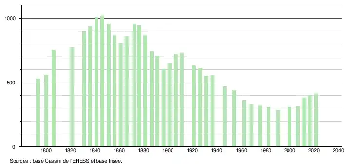 L'évolution du nombre d'habitants est connue à travers les recensements de la population effectués dans la commune depuis 1793. Pour les communes de moins de 10 000 habitants, une enquête de recensement portant sur toute la population est réalisée tous les cinq ans, les populations légales des années intermédiaires étant quant à elles estimées par interpolation ou extrapolation[37]. Pour la commune, le premier recensement exhaustif entrant dans le cadre du nouveau dispositif a été réalisé en 2006[38].
