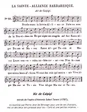 - Dans le recueil de la Musique des chansons de Béranger publié à Paris chez Perrotin en 1853 (6e édition) la même partition de l'Air de Calpigi accompagne à chaque fois les trois chansons : La Sainte-Alliance barbaresque (no 99, p. 64), Nabuchodonosor (no 164, p. 122) et les Orangs-Outangs (no 303, p. 251).