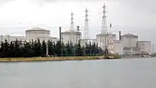 - une ou plusieurs tours de refroidissement, généralement la partie la plus visible des centrales thermiques, dont la hauteur en France atteint 178,5 m dans le cas de la centrale nucléaire de Golfech[53],[54]. Ces aéroréfrigérants n'équipent que les centrales dont la source froide (rivière ou mer) ne permet pas d'évacuer la chaleur nécessaire au fonctionnement. Les tours de refroidissement permettent de réduire la température de l'eau retournée à la source froide et ainsi d'en diminuer la pollution thermique. Les sites de bord de mer n'ont généralement pas de tour de refroidissement. La hauteur de ces réfrigérants peut être réduite pour des raisons visuelles ; par exemple, compte tenu de la proximité des châteaux de la Loire, les tours à tirage induit de la centrale de Chinon ne dépassent pas 30 m[note 1],[55].