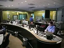 Vue d'ensemble d'un NOC. Devant, beaucoup de moniteurs ; derrière, une vue du réseau et une chaîne télévisuelle d'information à droite