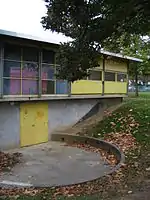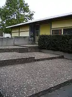 Selon un procédé fréquent dans les constructions de Prouvé, le bâtiment préfabriqué est assemblé sur un socle en béton brut qui abrite les services et équipements fonctionnels.