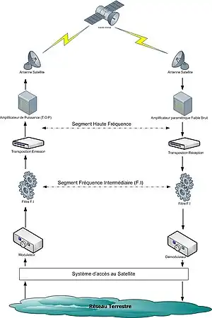 - amplification : élévation du niveau de la puissance, pour transmission vers le satellite.