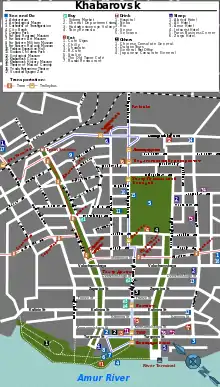 Le centre historique de Khabarovsk se situe dans l'arrondissement central, au bord du fleuve Amour. Il se situe en hauteur par rapport au fleuve sibérien, et le relief dans la zone peut être escarpé. Il y a ainsi la colline de l'Artillerie où se trouve la cathédrale de la Transfiguration et la colline de Sredni où se situe la cathédrale de l'Assomption (ru)[1]. Le centre forme une sorte de rectangle, avec au nord-ouest le boulevard de l'Amour (et la falaise de Khabarovsk/de l'Amour au niveau de la rive[2]) et au sud-est le boulevard de l'Oussouri. La rue Mouriavov-Amourski est l'axe centrale du quartier, quartier qui s'étale du fleuve jusqu'à la rue Pouckhine/Place Lénine[3].