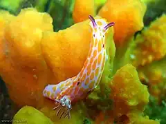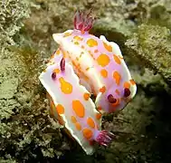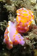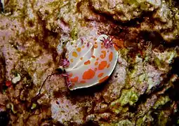 Le corps est allongé et oblong, arrondi à l'avant et en pointe en arrière avec le dos légèrement convexe. Le manteau est plus petit que le pied. Il est assez lisse et régulier, d'une couleur rose[1] lilas pâle ou violacé[2]. Il présente une rangée centrale de grandes taches oblongues orange vif[2] ou de nombreuses petites taches orange parmi lesquelles se trouvent quelques points rouge[1] et, à l'occasion, quelques taches, latérales proches de la marge, de couleur crème pâle ou blanc jaunâtre[2]. La marge du manteau est blanche[1]. Le pied est plus pâle que le manteau avec les côtés et les extrémités présentant une double rangée irrégulière de taches orange vif arrondies, considérablement plus longues que celles du manteau. Le dessous du pied est de couleur chair pâle. Les spicules du manteau manquent apparemment[2].