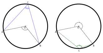 Prenons deux points distincts A et B du cercle. O est le centre du cercle et C est un autre point du cercle. Alors, on a