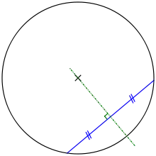 La médiatrice d'une corde passe par le centre du cercle. Ceci permet de trouver le centre d'un cercle : il suffit de tracer deux cordes non parallèles et de rechercher l'intersection de leurs médiatrices.