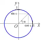 - , soit pour le cercle unité ou cercle trigonométrique (le cercle dont le centre est l'origine du repère et dont le rayon vaut 1) :