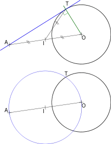 Considérons un cercle de centre O et un point A extérieur à ce cercle. On cherche une tangente à ce cercle passant par A ; le point de tangence est appelé T.