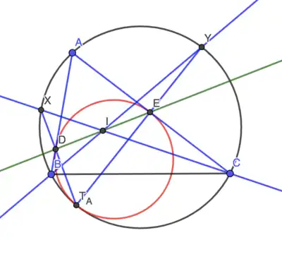 Soit la composée de l'inversion de pôle A et de rapport , et de la réflexion par rapport à la bissectrice en A. échange les sommets A et A et échange le centre du cercle inscrit avec le centre du cercle A-exinscrit. Puisque l'inversion et la réflexion sont bijectives et conservent les points de contact, fait de même. Ainsi, l'image du cercle A-exinscrit sous est un cercle tangent intérieurement aux côtés AB, AC et au cercle circonscrit de ABC, c'est un cercle A-mixtilinéaire inscrit.