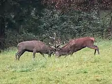 Le mâle avertit ainsi les femelles réceptives de sa présence, intimide ses concurrents potentiels et défie les autres mâles qui s'aventureraient sur son territoire. Il devient particulièrement agressif à ce moment-là. En cas de rencontre avec un autre mâle, après une phase d'intimidation, les deux adversaires vont mener un combat très violent durant lequel ils se projettent la tête en avant l'un contre l'autre dans le but de déséquilibrer l'adversaire. Ces combats peuvent conduire à l'abandon ou à des blessures assez graves voire la mort par épuisement des deux cerfs s'ils restent coincés par leurs bois emmêlés : seuls des mâles de puissance et de ramure comparables s'affrontent de la sorte.