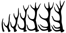 Les dimensions et la forme des bois varient individuellement, mais aussi selon l'âge et la sous-espèce[8]. Contrairement à une croyance répandue, le nombre de cors n'a pas de rapport direct avec l'âge[réf. souhaitée]. Le premier cor se nomme andouiller de massacre, le second surandouiller.