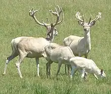 Exceptionnellement, des cerfs ont un pelage blanc, tels qu'en captivité au parc de Dyrehaven (Danemark), et au moulin de Poyaller (dans les Landes, en France)[7] ou à l'élevage de la belle charme en Haute-Marne (Champagne-Ardenne).
