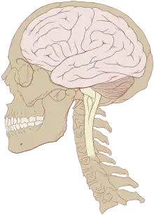 Le cerveau de l'ensemble des chordés présente fondamentalement la même structure[17]. Il est constitué d'un tissu mou d'une texture gélatineuse[18]. De manière générale, le tissu cérébral vivant est rosâtre à l'extérieur et blanchâtre à l'intérieur. Le cerveau des chordés est enveloppé d'un système membranaire de tissu conjonctif, les méninges, qui sépare le crâne du cerveau[19]. De l'extérieur vers l'intérieur, les méninges sont composées de trois membranes : la dure-mère, l'arachnoïde et la pie-mère. L'arachnoïde et la pie-mère sont étroitement connectées entre elles et peuvent ainsi être considérées comme une seule et même couche, la pie-arachnoïde. Compris entre l'arachnoïde et la pie mère, l'espace sous-arachnoïdien contient le liquide cérébro-spinal qui circule dans l'étroit espace entre les cellules et à travers les cavités appelées système ventriculaire. Ce liquide sert notamment de protection mécanique au cerveau en absorbant et amortissant les chocs et à transporter hormones et nutriments vers le tissu cérébral. Les vaisseaux sanguins viennent irriguer le système nerveux central à travers l'espace périvasculaire au-dessus de la pie-mère. Au niveau des vaisseaux sanguins, les cellules sont étroitement jointes, formant la barrière hémato-encéphalique qui protège le cerveau en agissant comme un filtre vis-à-vis des toxines susceptibles d'être contenues dans le sang.