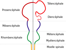 Chez les chordés, les premières étapes du développement sont communes à toutes les espèces[47]. Tandis que l'embryon passe d'une forme ronde à une structure de type vermiforme, une étroite bande de l'ectoderme se décolle de la ligne médiane dorsale pour devenir la plaque neurale, précurseur du système nerveux. La plaque neurale se creuse, s'invagine de manière à former la gouttière neurale puis, les plis neuraux qui bordent la gouttière fusionnent pour fermer la gouttière qui devient le tube neural. Ce tube se subdivise ensuite en une partie antérieure renflée, la vésicule céphalique primitive, qui se segmente en trois vésicules qui deviendront le prosencéphale, le mésencéphale, et le rhombencéphale[47]. Le prosencéphale se divise ensuite en deux autres vésicules, le télencéphale et le diencéphale tandis que le rhombencéphale se divise en métencéphale et myélencéphale. Chacune de ces vésicules contient des zones prolifératives dans lesquelles neurones et cellules gliales sont formés. Ces deux types de cellules migrent ensuite, parfois sur de longues distances, vers leurs positions finales.