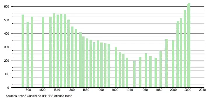L'évolution du nombre d'habitants est connue à travers les recensements de la population effectués dans la commune depuis 1793. Pour les communes de moins de 10 000 habitants, une enquête de recensement portant sur toute la population est réalisée tous les cinq ans, les populations légales des années intermédiaires étant quant à elles estimées par interpolation ou extrapolation[36]. Pour la commune, le premier recensement exhaustif entrant dans le cadre du nouveau dispositif a été réalisé en 2005[37].