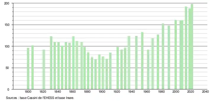 L'évolution du nombre d'habitants est connue à travers les recensements de la population effectués dans la commune depuis 1800. Pour les communes de moins de 10 000 habitants, une enquête de recensement portant sur toute la population est réalisée tous les cinq ans, les populations légales des années intermédiaires étant quant à elles estimées par interpolation ou extrapolation[21]. Pour la commune, le premier recensement exhaustif entrant dans le cadre du nouveau dispositif a été réalisé en 2008[22].