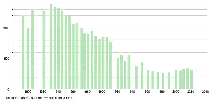 L'évolution du nombre d'habitants est connue à travers les recensements de la population effectués dans la commune depuis 1793. Pour les communes de moins de 10 000 habitants, une enquête de recensement portant sur toute la population est réalisée tous les cinq ans, les populations légales des années intermédiaires étant quant à elles estimées par interpolation ou extrapolation[19]. Pour la commune, le premier recensement exhaustif entrant dans le cadre du nouveau dispositif a été réalisé en 2005[20].