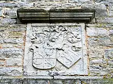 La haute tour-porche d'entrée de trois niveaux avec armoiries (voir Historique) et pigeonnier se situe au milieu de l'aile nord et est surmontée d'une toiture en ardoises à quatre pans.