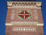 Le château d'eau est une tour ouvragée, couverte d'un toit en forme de pyramide.