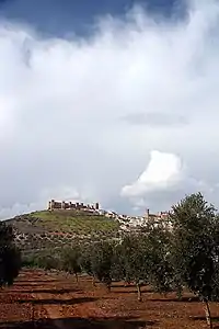 D’apparence simple, il se présente sous la forme d’un vaste périmètre ovoïdal, ponctué de quatorze tours rectangulaires de hauteur égale dépassant à peine celle de la muraille. Ces quatorze tours, dont la sévérité et la proximité confèrent à l’ensemble un caractère défensif affirmé, sont complétées par le donjon, ou Torre del Homenaje (également appelée almena gorda), bâti au XVe siècle. Celui-ci est placé à l’extrémité de la muraille. Il s’organise sur un plan semi-cylindrique, et occupe en réalité l’espace d’une tour omeyyade détruite. Ce genre de tour, imposante, ne se retrouve pas dans l’architecture musulmane hispanique, mais répond bien à des canons architecturaux chrétiens : le donjon représente le pouvoir de son occupant. Ainsi, sa position, non pas en direction de la campagne, mais vers le village, révèle son utilisation symbolique, à relier aux coutumes féodales[4].