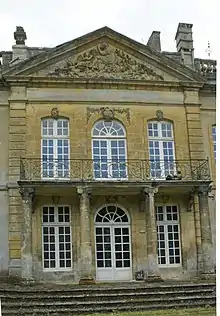 La façade côté parc, de style Louis XIV[4] est couronnée d'un fronton triangulaire sculpté de figures féminines. L'étage est doté d'un large balcon sur portique central, et de têtes de macarons placées au-dessus des fenêtres.