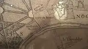 - Il s'agit d'un détail issu d'une carte des environs de Paris, réalisée par l'abbé Jean Delagrive en 1731, portant l'intitulé : « Seconde feuille de la carte des environs de Paris et levée et gravée par M. l'Abbé Delagrive »[48], et sur lequel figure L'original de ce plan est actuellement conservé dans l'aile Richelieu de la BnF, sous la cote d'inventaire « GE C-9277 »[48],[49], dont un duplicata, réalisé en 1740[14],[50] est exposé au musée de Nogent-sur-Marne. Sur ce document figure, entre autres, le site du moulin et de la porte de Beauté[14],[50],[48].