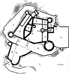 - les murs du logis à l'ouest de la cour intérieure sont surélevés (en E sur le plan) afin d'ajouter un étage supplémentaire ;