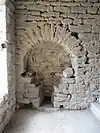 La partie supérieure est accessible par un escalier extérieur supporté par une voûte en berceau. Une porte en plein cintre donne sur le palier d'entrée. L'épaisseur du mur à cet endroit est de 1,8m.