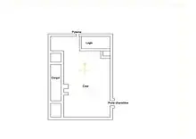 Le reste d'un aménagement pour un évier est visible dans le mur Ouest. Ce même mur présente deux grands trous, aucune trace ne vient confirmer s'il y avait des ouvertures à ces emplacements.