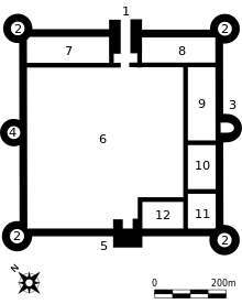 La tour nord-ouest présente une salle basse, avec accès par l'exposition, sous voûtes d'arêtes. Un seul jour apporte la lumière d'où le tir est impossible. La salle haute n'était accessible que par le chemin de ronde et sa voûte.