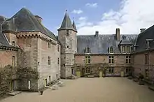 Flanqué de deux pavillons d'angle carrés, le château possède également un donjon du XIVe siècle à deux étages couronné de mâchicoulis.