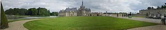Il lègue l'ensemble à l'Institut de France, sous le nom de musée Condé. Le château occupe l'emplacement d'une forteresse médiévale. Les Grandes Écuries, construites de 1719 à 1740, chef-d'œuvre de l'architecte Jean Aubert, abritent aujourd'hui le musée du cheval. Les jardins sont une des plus remarquables créations d'André Le Nôtre. La ville de Chantilly se développe à l'ouest du château pendant et après la Révolution française. Le château et ses dépendances font l'objet de plusieurs protections au titre des monuments historiques durant l’année 1988[1] après une première protection par arrêté du , annulée.