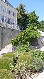 - les jardins en terrasses devant le château y compris les murs de clôture latéraux, les murs de soutènement, les fontaines et la grotte ;