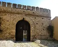 On accédait au château grâce à un pont en maçonnerie en partie fixe et en partie un pont-levis en bois. La porte principale était insérée dans une tour en forme de pyramide tronquée qui dominait les courtines occidentales entre les deux tours d'entrée, le pont et les douves. Dans les douves, étudiées en 2011 par la Surintendance du patrimoine archéologique de Calabre, a été mise au jour la base de la grande tour quadrangulaire appelée "Torre della manivella", avec laquelle le pont a été surélevé.